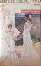 Dress, floor or mid-knee (at front) length, has fitted, shaped, dropped waist bodice with side front and side back seams, flared skirt with side front and side back seams (no side seams), shoulder and back bow with knot and back zipper. A: contrast bodice and long sleeves with button/loop. B: sleeveless. A,B: shaped front hemline. C: above elbow sleeves with elastic and underdress. A,C: self-lined skirt and purchased trim. Formal and Bridal sewing pattern copyright 88 and added 7/11/16 by td.