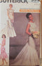 Dress, floor length, has semi-fitted, lined bodice with front inset and ruffles, flared skirt with side panels (no side seams) and back-button/loop and zipper closing. A: collar, back inset, overskirt and long sleeves with stiffening at cap and button/loop at lower edge. B: contrast B,C sleeveless, train, overskirt with side front seams (no side seams), ruffles and pleated cummerbund. Purchased ribbon and flowers. Bridal sewing pattern copyright 87 and added 7/11/16 by td.