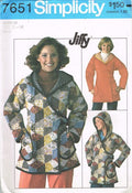 The top-stitched hooded jacket with edges encased in braid, long kimono sleeves, dropped shoulders and pockets has belt fastened in back with buttons or decorative snap fasteners. Retro sewing pattern printed 1976 and added 10/29/13.