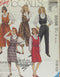 Pull-on jumpsuits have elastic in waistline and bodice back casings. A, B, C, D ties in back of neck. E, F has straps hooked to back bodice. Bias skirt, worn over short jumpsuit has back zipper. This sewing pattern was printed in 77 and added on 9-25-14 by jh.