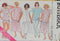 Dress, lower calf, has shoulder pads, loose-fitting bodice, raised waist, tie ends, slightly flared, pleated/gathered skirt, back zipper and long sleeves. A: contrast collar/cuffs. A,B: tab with button trim. C: purchased trim. D: contrast, lined overlay and tie ends.