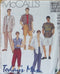 Semi-fitted shirt jacket has pointed collar-on-band, front and back yokes, full-length two-piece sleeves pleated into buttoned cuffs, front buttoned band closing, patch pockets with buttoned flaps, side front seams, and back vent. Close-fitting, slightly flared pants, darted into buttoned waistband have slanted pockets, fly closing, and belt carriers. Topstitch trim. Purchased tops and belt. Pattern envelope in bad shape.Vintage shirt, jacket and pants sewing pattern added 2/20/14.