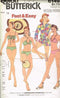 Lined bikini bra has self drawstring neckline can be tied various ways, elasticized edges and hook closure in back. Lined bikini briefs have elasticized edges. Loose-fitting cover-up has pointed collar, front neckline slit, self tie belt and full length kimono sleeves worn rolled up. QUICK BUTTERICK sewing pattern added 10/23/17 by td.