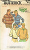 Loose-fitting top has pointed collar, front band opening with self tab trim, full-length two piece raglan sleeve with purchased contrast rib knit cuffs, and purchased contrast rib knit band at lower edge and pockets in side seams. Edgestitching and topstitching. Purchased top. Sewing pattern.
