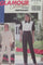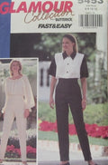 FROM THE GLAMOUR COLLECTION: Fast & Easy! Blouse A has contrast collar and above elbow sleeves, extended shoulders, shoulder pads and pocket. Pullover blouse B has drawstring nuckline and long sleeves with elastic. A and B very loose-fitting and narrow hem. Tapered pants, below ankle length have raised waist and back zipper. This sewing pattern was printed in 91 and added on 9-14-14 by jh.