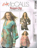 Wrap front tops in two lengths have front band and closure, length variations; top A with flounce sleeve and side slit; top B has side slits and contrasting tie belt; top C has contrasting sleeve band and side slits; tops B, C have contrasting front and back bands. Out of print sewing pattern printed in 06 and added 11/8/14 by td.