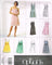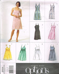 Dress, above mid-knee variations or mid-knee, has straps, bodice/skirt variations, raised waist and back zipper. A,B: purchased straps. F: straps extended into tie ends. A,F: purchased trim. H: self ruffle on upper edge of skirt. B,C,D,E,G,I: narrow hem. VOGUE EASY options sewing pattern printed 00 and added 11/16/14 by td.