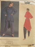 CUT Very loose-fitting pullover tunic has back neckline slit with buttons and thread loop closing, shaped hemline and narrow self bias binding at neckline and lower edge of sleeves. Sash holds in fullness at waistline. Pants, loose-fitting through hip and narrowing to ankles have front and back pleated into elasticized waistline and side hemlines slits. Both have edgestitching and narrow hem. Vogue vintage INTERNATIONAL DESIGNERS GIANNI VERSACE sewing pattern