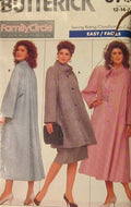 Very loose-fitting, lined, flared coat, 7/8 or lower calf, has bias collar, shoulder pads, welt pockets, back hemline vent and and long sleeves. Family Circle COLLECTION Sewing Rating EASY sewing pattern copyright 87 and added 1/12/16 by td.