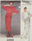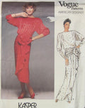 Misses Dress: Dress, lower calf or evening length, has extended shoulders, shoulder pads, shoulder tucks, very loose-fitting, blouson bodice with concealed back button closing, straight, wrap front draped skirt, back zipper , attached bias draped with bow and 7/8 sleeves.