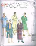 Men's sleepware: Loose fitting wrap robe in two lengths features patch pockets and tie belt; pullover nightshirt and top have sleeve variations; pull-on pants and shorts have elastic at waist.