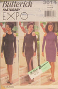 Misses dress; Close fitting, tapered dress, mid-knee or evening length, has neckline variations, cut-out shoulders, back zipper and long sleeves. A; collar, B, C; side hemline slit.