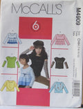 Out of print sewing pattern for Fitted, pullover top has long or cap sleeves with separate, self fabric or contrast lower sleeves and narrowed hems; top A,B are tiered and have contrast or self fabric front self fabric collar; tops A,B,E,F have flounces and collars have unfinished edges