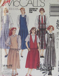 Out of print sewing pattern for Set of jumpers with lined bodice variations; A thu D have front buttons; E,F have back zipper closure; gathered skirts A,C and E have side front pockets; split skirts B,D and F have front and back pleats and side seam pockets.