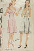 The top front of Style 1 has soft fulness and is joined with a shaped seam. Each side of the center front and back is seamed. A small hem and three rows of top-stitching finish the lower edge. The side opening is conveniently fastened with snaps. Style 11 is seamed on each side of the center front and back. The top edge is joined to a waist band which buttons at the left side. Wide lace trims the lower edge.