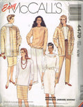 FOR STRETCH KNITS ONLY: Loose fitting Jacket with buttoned front opening has extended shoulders, long sleeves and patch pockets. Pullover Tunic A and Top B, C have extended shoulders, long sleeves, shoulder pads and back buttoned neck opening. Top C has elastic in lower casing. Pull-on Skirt or Pants have elastic in waistline casing and side seam pockets. Skirt has back vent. Pattern for Scarf included. Out of print sewing pattern printed 1989 and added 10/30/13.